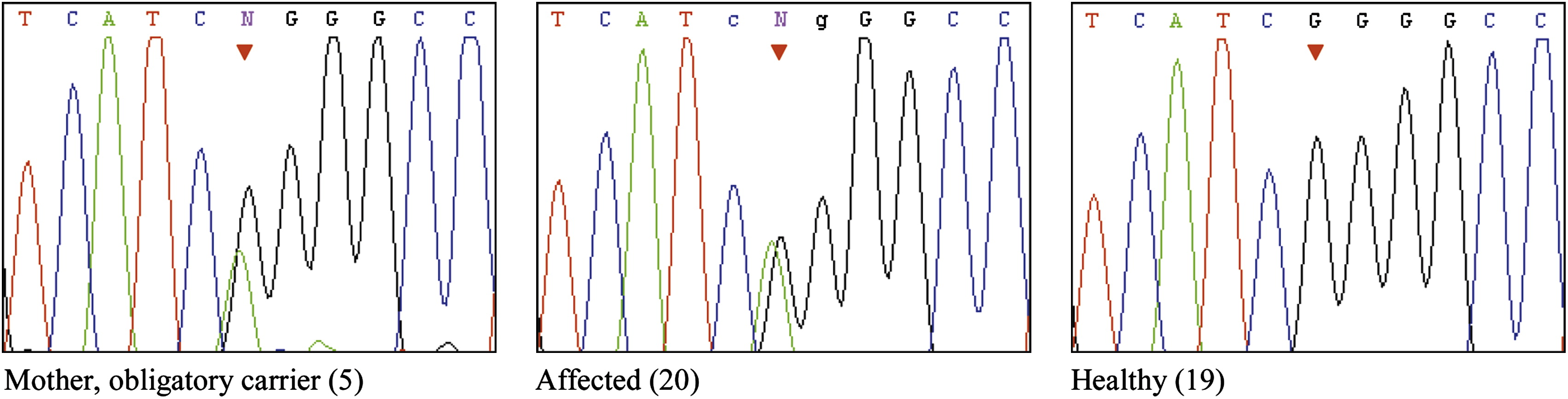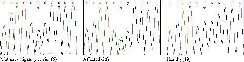 Figure 3 Analysis of the 770G→A Mutation in Exon 2 of KCNK9. Sequence analysis of a healthy obligatory-carrier mother and her affected and healthy offspring.