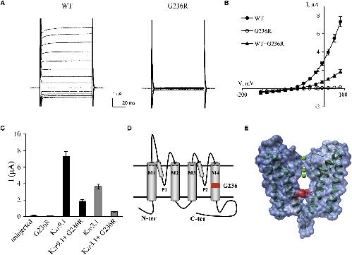 Figure 4 The K2P9.1-G236R Mutant Does Not Produce Functional Channels. Macroscopic currents measured by two-electrode voltage clamp.