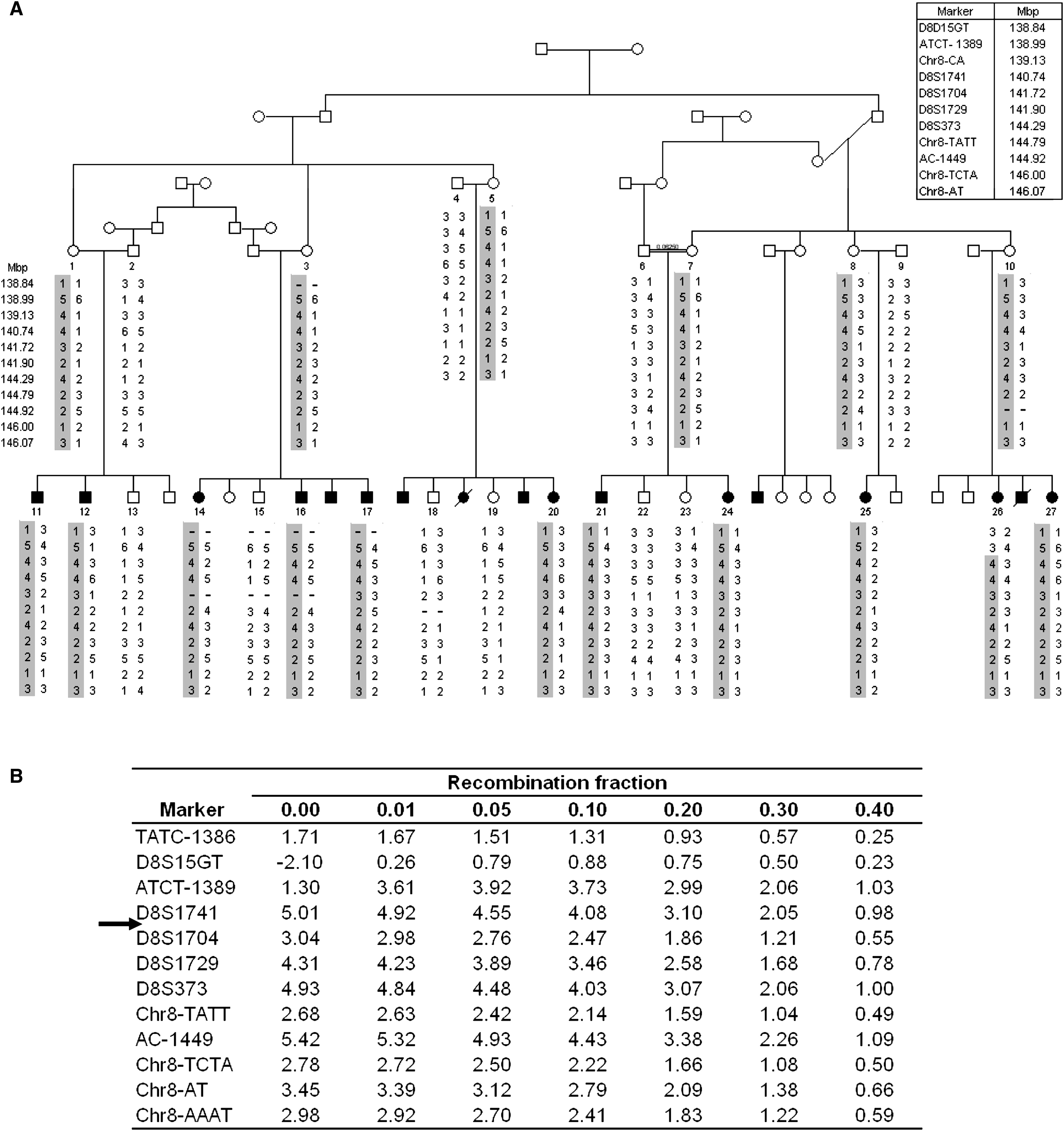 (A) Partial pedigree and segregation analysis of the affected family. The numbers denote individuals whose DNA samples were analyzed. Haplotypes are represented as columns of numbers; the disease-associated haplotype is shaded. Physical distances between the markers are shown.
