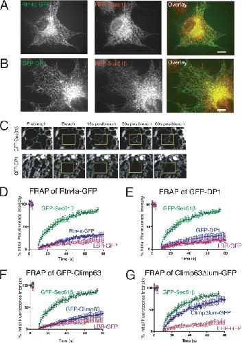 FIGURE 5. Mammalian Rtn4a-GFP and GFP-DP1 have slow, restricted lateral mobilities in ER tubules. A and B, Rtn4a-GFP and GFP-DP1 (both in green) expressed in COS-7 cells localize only to the tubular ER, whereas a normal resident ER membrane protein, RFP-Sec61β (red) localizes to all ER subdomains, including the nuclear envelope and peripheral sheets. C, fluorescence recovery of GFP-DP1 compared with the control membrane protein GFP-Sec61β. Images were taken before and then after the photobleach for the times indicated. The boxed region shows the area that was photobleached. D, quantitation of FRAP analyses of Rtn4a-GFP (blue; n = 7 cells) compared with GFP-Sec61β (green; n = 6) and LBR-GFP (red; n = 3), where the average fluorescence intensity normalized to prebleach values was plotted over time. E, quantitation of FRAP analyses of GFP-DP1 (blue; n = 9) compared with GFP-Sec61β (green) and LBR-GFP (red). F, quantitation of FRAP analyses of GFP-Climp63, an ER membrane protein known to be immobile through homo-oligomerization (blue; n = 6), compared with GFP-Sec61β (green) and LBR-GFP (red). G, quantitation of FRAP analyses of Climp63Δlum-GFP, a mutant form of Climp63 lacking its luminal homo-oligomerization domain (blue; n = 5), compared with GFP-Sec61β (green) and LBR-GFP (red). All error bars indicate ± S.E.
