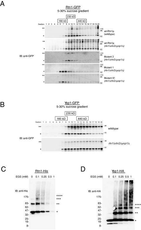 FIGURE 2. Yeast Rtn1p and Yop1p form homo-oligomers in the membrane. A, membranes isolated from wild-type or rtn1Δrtn2Δyop1Δ (NDY257) yeast cells expressing wild-type or mutant forms of Rtn1-GFP at endogenous levels were solubilized in 1% digitonin, fractionated by 5–30% w/v sucrose gradient centrifugation, and analyzed by SDS-PAGE and immunoblotting with anti-GFP antibody. Note that the mutant forms of Rtn1p have peak migrations at a smaller molecular weight than the wild-type protein. B, membranes isolated from wild-type or rtn1Δrtn2Δyop1Δ yeast cells expressing wild-type Yop1-GFP at endogenous levels were solubilized in 1% digitonin and were analyzed as in A. Molecular weight standards in the sucrose gradient are as indicated. C, isolated membranes of yeast cells expressing Rtn1-His were treated with increasing concentrations of EGS and analyzed on SDS-PAGE, and oligomers were visualized by immunoblotting with anti-His antibody. D, membranes of yeast cells expressing Yop1-HA were analyzed as in C and immunoblotted with anti-HA antibody. Asterisks, number of monomeric copies of the specified protein as seen by SDS-PAGE.