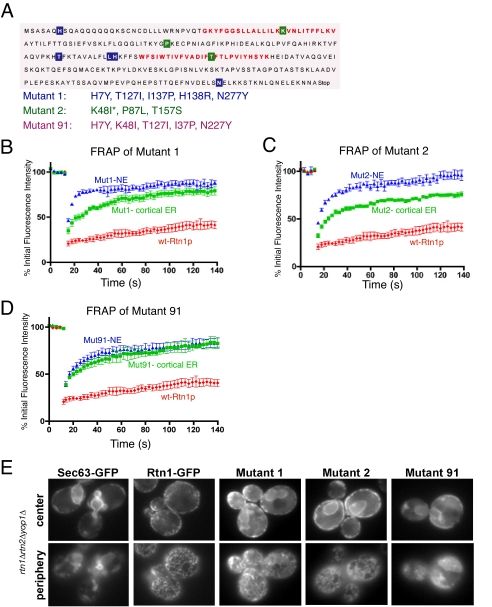 FIGURE 3. A yeast Rtn1p mutant with defects in localization and oligomerization also cannot shape tubules in vivo. A, mutations in Rtn1 Mutant 1, Mutant 2, and Mutant 91 that affect the ability of the protein to localize exclusively to the tubular ER. The residues altered in Mutant 1 are shown in blue, and those in Mutant 2 are shown in green. K48I is responsible for the altered localization of Mutant 2. The combined mutations of Mutant 91 are indicated in purple. The two membrane-embedded regions are indicated in red. B–D, fluorescence intensities normalized to prebleach values plotted over time from FRAP analyses of Rtn1-GFP Mutant 1 (B), Mutant 2 (C), or Mutant 91 (D) expressed in wild-type S. cerevisiae cells. Error bars indicate ± S.E., n = 4–8 cells. E, the indicated GFP fusions were constitutively expressed under their endogenous promoters in rtn1Δrtn2Δyop1Δ cells. The ER was visualized by focusing on either the center or periphery of the cell. Note that wild-type, Mutant 1, and Mutant 2 Rtn1-GFP restore tubular ER structure, whereas Mutant 91 and the control protein Sec63-GFP do not.