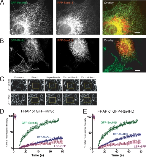 FIGURE 6. The conserved RHD is sufficient for the diffusional immobility of the mammalian reticulons. A and B, exclusive tubular ER localization of GFP-Rtn4HD and GFP-Rtn3c (both in green), two reticulon isoforms containing only the conserved reticulon homology domain, compared with the general membrane protein RFP-Sec61β (red) when expressed in COS-7 cells. C, typical FRAP experiments performed in COS-7 cells comparing the fluorescence recovery of GFP-Rtn3c to GFP-Sec61β illustrates that reticulons containing only the RHD is relatively immobile. Images were taken before and then after the photobleach for the times indicated. The boxed region shows the area that was photobleached. D, quantitation of FRAP analyses of GFP-Rtn3c (blue; n = 6) compared with GFP-Sec61β (green) and LBR-GFP (red), where fluorescence intensities normalized to prebleach values were plotted over time. E, quantitation of FRAP analyses of GFP-Rtn4HD (blue; n = 14), compared with GFP-Sec61β (green) and LBR-GFP (red). All error bars indicate ± S.E.