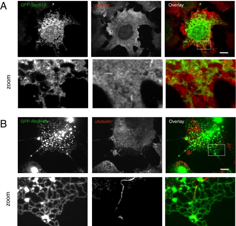 FIGURE 8. Overexpression of a reticulon stabilizes the tubular ER in the absence of microtubules in mammalian cells. A, a typical COS-7 cell expressing GFP-Sec61β (green), where microtubules have been depolymerized by nocodazole treatment (immunostained with anti-αtubulin, red), has collapsed, sheet-like peripheral ER. The lower row of panels shows an enlargement of the boxed region from the top panels. B, a typical COS-7 cell expressing GFP-Rtn3c (green) after microtubule depolymerization (stained in red) leads to an accumulation of bright foci containing Rtn3c but also retains much more tubular ER. The lower row of panels shows an enlargement of the boxed region from the top panels. Scale bar, 10 μm.