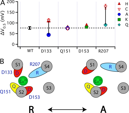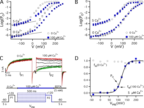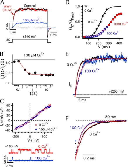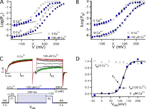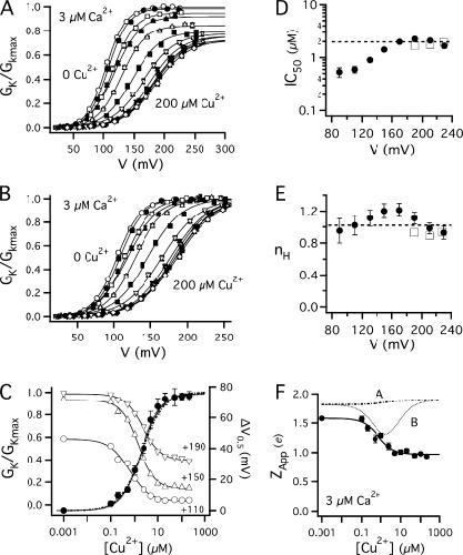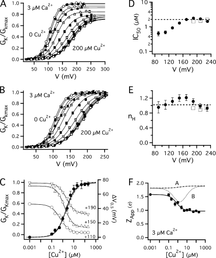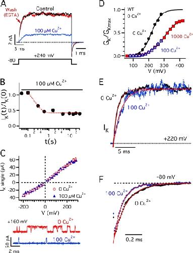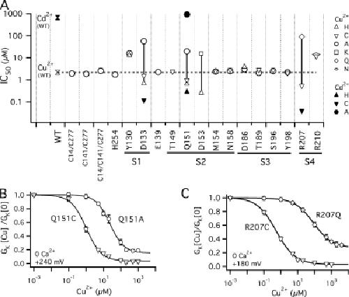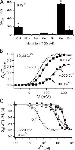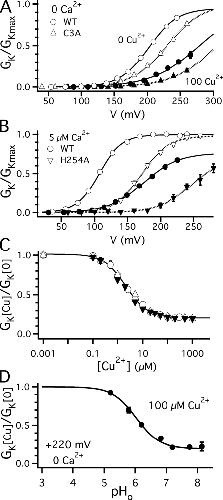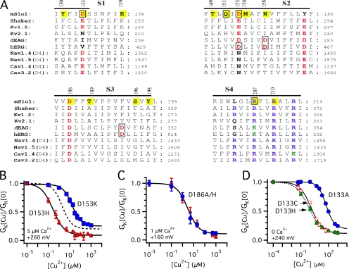 Copper is an essential trace element that may serve as a signaling molecule in the nervous system. Here we show that extracellular Cu2+ is a potent inhibitor of BK and Shaker K+ channels. At low micromolar concentrations, Cu2+ rapidly and reversibly reduces macrosocopic K+ conductance (G(K)) evoked from mSlo1 BK channels by membrane depolarization. GK is reduced in a dose-dependent manner with an IC50 and Hill coefficient of 2 microM and 1.0, respectively. Saturating 100 microM Cu2+ shifts the GK-V relation by +74 mV and reduces G(Kmax) by 27% without affecting single channel conductance. However, 100 microM Cu2+ fails to inhibit GK when applied during membrane depolarization, suggesting that Cu2+ interacts poorly with the activated channel. Of other transition metal ions tested, only Zn2+ and Cd2+ had significant effects at 100 microM with IC(50)s > 0.5 mM, suggesting the binding site is Cu2+ selective. Mutation of external Cys or His residues did not alter Cu2+ sensitivity. However, four putative Cu2+-coordinating residues were identified (D133, Q151, D153, and R207) in transmembrane segments S1, S2, and S4 of the mSlo1 voltage sensor, based on the ability of substitutions at these positions to alter Cu2+ and/or Cd2+ sensitivity. Consistent with the presence of acidic residues in the binding site, Cu2+ sensitivity was reduced at low extracellular pH. The three charged positions in S1, S2, and S4 are highly conserved among voltage-gated channels and could play a general role in metal sensitivity. We demonstrate that Shaker, like mSlo1, is much more sensitive to Cu2+ than Zn2+ and that sensitivity to these metals is altered by mutating the conserved positions in S1 or S4 or reducing pH. Our results suggest that the voltage sensor forms a state- and pH-dependent, metal-selective binding pocket that may be occupied by Cu2+ at physiologically relevant concentrations to inhibit activation of BK and other channels.