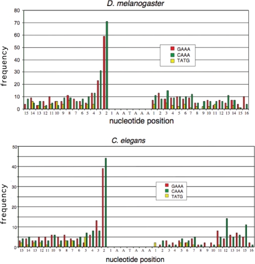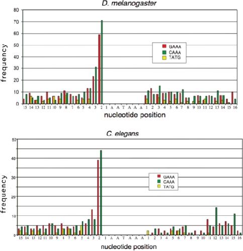 Figure 6. The frequency of GAAA immediately upstream and downstream of the polyadenylation signal. One thousand mRNA sequences from C. elegans and D. melanogaster were scanned in 1-nt increments using a 4-nt window. The frequency of the sequences GAAA, CAAA and TATG are presented as histograms relative to the position of the AATAAA hexanucleotide sequence.
