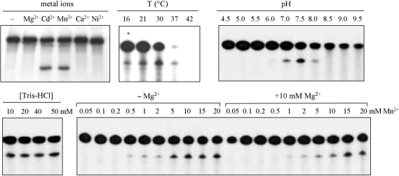 Figure 2. Characterization of the self-cleavage reaction. All reactions were carried out in standard conditions, excepting the indicated variable. The metal dependence of cleavage was tested with the indicated divalent cation at a concentration of 10 mM.