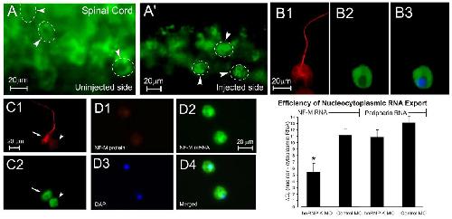 Fig. 8. FISH and immunohistochemistry for NF-M. (A,Aâ²) NF-M FISH of single confocal optical sections from opposite sides of spinal cord or unilaterally injected hnRNP K MO1 tadpole (stage 39/40). Broken outlines surround individual neurons. (B1-D4) Cells from dissociated cell culture. (B1-B3) Control MO neuron stained for NF-M protein (B1), RNA (B2) and RNA/DAPI merged (B3). (C1,C2) Adjacent cells from a unilaterally injected hnRNP K MO culture, viewed for NF-M protein (C1) and RNA (C2). Arrow indicates normal staining for both protein and RNA; arrowhead indicates a cell with no protein and FISH pattern typical of hnRNP K MO-injected spinal cord neurons from whole mount. (D1-D4) Neurons from a bilaterally injected hnRNP K MO culture stained for protein (D1), RNA (D2), DAPI (D3) and RNA/DAPI merged (D4). Scale bars in B1,C1 and D2 apply to B1-3,C1-2 and D1-4, respectively. Bar graph shows qRT-PCR of nuclear and cytoplasmic fractions for NF-M and peripherin RNAs from bilaterally injected hnRNP K MO and control animals assayed at stage 29/30. δCT, mean (±s.d.) difference in the number of PCR cycles to reach threshold (see text). *δCT was significantly less for NF-M RNA in hnRNP K MO embryos than for other groups (P<0.01, one-way ANOVA). |