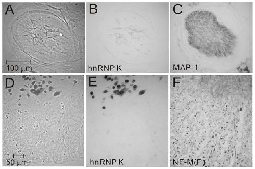 Fig. S1. Absence of hnRNP K from axons. (A-F) Transverse sections of optic nerve (A-C) and ventral spinal cord (D-F). Sections were stained by immunoperoxidase with diaminobenzidine/nickel chloride. Phase-contrast (A,D) and bright-field (B,E) views of sections stained for hnRNP K. Comparable sections are stained for MAP-1 (C) and a phosphorylated epitope of NF-M (F) to label axons. Ventral motoneurons are at the top of D-F. Scale bars: in A, 100 for A-C; in D, 50 for D-F, respectively. |