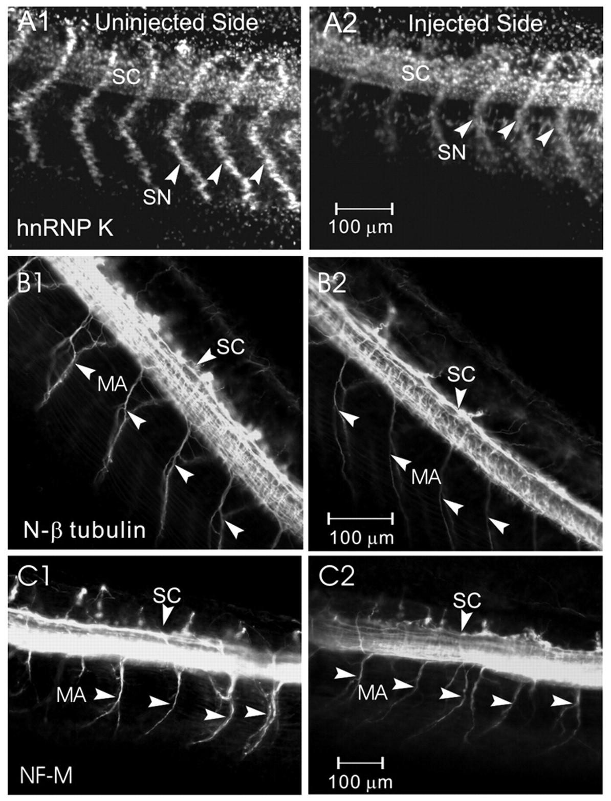 Fig. 5. Rescue from hnRNP K MO by co-injection of hnRNP K RNA. Two-cell embryos were unilaterally injected with hnRNP K MO1 plus 100 pg of hnRNP K RNA, then processed for whole-mount immunostaining for hnRNP K (A1,A2), neuronal β-tubulin (B1,B2) or NF-M (C1,C2). Images are stacks of five confocal microscopic optical sections taken from the uninjected (A1,B1,C1) and injected (A2,B2,C2) sides of the same animal, parasagitally through the spinal cord. SC, spinal cord; MA, motor axons; SN, cellular nuclei of somitic myotomes. Scale bars in A2,B2,C2 also apply to A1,B1,C1, respectively. |