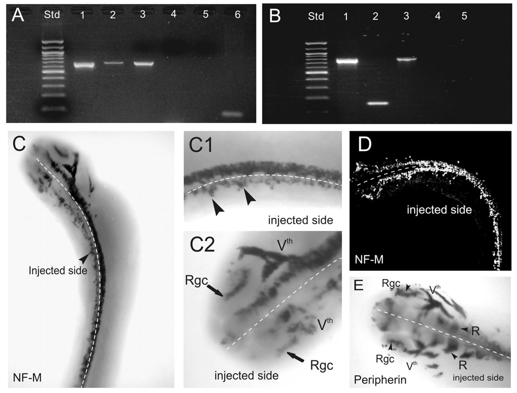 Fig. 6. Binding to hnRNP K and expression of NF-M mRNA in vivo. (A,B) Co-immunoprecipitation and RT-PCR of NF-M (A) and peripherin (B) mRNAs with hnRNP K from juvenile brain. (1) NF-M PCR from plasmid template with Xenopus NF-M cDNA insert, which served as a positive control for NF-M PCR amplification. (2) NF-M RT-PCR of sample prior to co-IP, demonstrating NF-M mRNA presence in the lysate. (3) NF-M RT-PCR of anti-hnRNP K co-IP. (4) NF-M RT-PCR of anti-β-galactosidase co-IP, a control for non-specific IP. (5) EF1-α RT-PCR of hnRNP K co-IP, demonstrating absence of mRNAs not associating with hnRNP K. (6) EF1-α RT-PCR of TIC, demonstrating its presence in lysate. (B) (1,2) peripherin PCR from plasmid template, which served as positive controls for peripherin PCR with each primer set. (3) peripherin RT-PCR of lysate prior to co-IP using the first pair of primers (30 cycles). (4,5) peripherin RT-PCR of anti-hnRNP K co-IP with the first (30 cycles) and second (15 additional cycles) pair of nested primers, respectively. Std, 1 kb DNA ladder (NE Biolabs). (C-E) Expression of NF-M and peripherin mRNAs in unilaterally injected hnRNP K MO animals. Dorsal views in whole mount of the entire animal (C), spinal cord (C1) and head (C2) of a stage 39/40 tadpole, processed for NF-M in situ hybridization (digoxigenin-alkaline phosphatase). Stained neurons are on both sides of the spinal cord (C; arrowheads in C1) as well as in brain, trigeminal ganglion (Vth) and retinal ganglion cells (Rgc, C2). (D) Horizontal confocal optical section of a unilaterally injected stage 39/40 hnRNP K MO tadpole processed for NF-M FISH. Rostral is towards the upper left. (E) Dorsal view of the head of a stage 39/40 hnRNP K MO tadpole stained for peripherin mRNA. R, rhombomeres. |