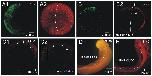 Fig. 3. Suppression of hnRNP K expression by antisense MO. Embryos were unilaterally injected with two separate non-overlapping hnRNP K MOs (MO1 in A-D; MO2 in E). (A1,A2) Stage 10 gastrula; persistent maternal hnRNP K expression. (B1,B2) Stage 15 neural plate stage; suppression of hnRNP K expression on the injected side (left of broken line). Upper arrowhead, neural fold; lower arrowhead, somitic mesoderm, on the uninjected side. (C1,C2) Stage 22 tailbud stage; hnRNP K expression in myotome, spinal cord and brain (arrowheads, left to right, respectively) was suppressed on the injected side (C2) when compared with the uninjected side (C1). Because the animals are bent, the optical section in C2 also contained some cells from the uninjected side of the embryo (rectangle). (D,E) Three-day tadpole (stages 39 and 40); the uninjected side exhibited normal staining and morphology, but the injected side exhibited only background immunostaining and some defects in somites. (A1-C2,E) Confocal optical sections; (D) fluorescence dissecting microscopic view of whole animal. hnRNP K immunostaining, red; co-injected FITC-dextran, green. |