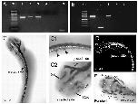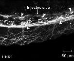 Fig. 4. Suppression of axonal outgrowth by hnRNP K MO in intact animals. Embryos unilaterally injected with control MO (A), hnRNP K MO1 (B,D-H) or hnRNP K MO2 (C) processed at stage 37/38 by whole-mount immunofluorescence. (A-C) Embryos injected with control MO (A), hnRNP K MO1 (B) or MO2 (C), and immunostained for NF-M. Broken lines separate injected (lower) from uninjected (upper) sides. (B,C) Arrowheads on the injected side indicate peripheral motor axons; arrowheads on the uninjected side indicate residual wispy peripheral axons. (A) View under the fluorescence dissecting microscope; (B,C) stacked confocal optical sections. (D1) Neuronal β-tubulin staining in neuronal perikarya and peripheral axons of spinal cord, uninjected side. (D2) Tubulin staining in perikarya and a few scattered fibers, injected side. (E1-G2) Peripherin immunostaining of head (E1,E2) and spinal cord (F1,F2,G1,G2). (E1,F1,G1) Uninjected side; (E2,F2,G2) injected side. (E1,E2) Trigeminal ganglion neuronal perikarya (upper arrowhead) and nerves (lower arrowhead). (F1,F2) Spinal cord with peripheral motor axons. (G1,G2) Spinal cord neuronal perikarya. (H) Spinal cord immunostained for HNK-1. Robust staining of neuronal perikarya and axons on the uninjected side (below the broken line); clusters of stained neuronal perikarya (arrowheads) and very few fibers on the injected side (above the broken line). Scale bars in D1,E2,F1 and G2 also apply to D2,E1,F2 and G1, respectively. |