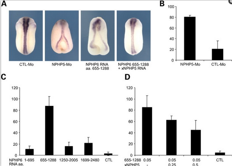 Fig 7. Expression of nephrocystin-6 amino acids 665â1288 phenocopies the early developmental defects in Xenopus laevis caused by the depletion of neophrocystin-5. (A) X. laevis embryos were injected with either NPHP5 MO or RNA coding for amino acids 665â1288 of human nephrocystin-6 and/or full-length xNPHP5 into both dorsal blastomeres. At Nieuwkoop-Faber stage 19, embryos were analyzed for neural tube closure defects, and neural folds were visualized by sox3 in situ hybridization. (B) Depletion of NPHP5 resulted in neural tube closure defects in 80% of analyzed embryos (0.4 mm NPHP5 MO). (C) Expression of the nephrocystin-6 fragment amino acids 665â1288 caused prominent neural tube closure defects, while the expression of other truncations of nephrocystin-6 displayed only marginal effects (0.1 ng RNA). (D) Increasing doses of xNPHP5 RNA (0.25 and 0.5 ng) rescued the neural tube closure defects caused by the expression of nephrocystin-6 amino acids 665â1288 RNA (0.05 ng). In at least three independent experiments more than 90 embryos were injected in each group. Error bars represent standard deviation.