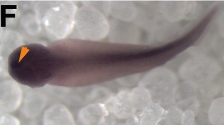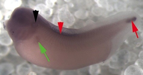 per 1 (period circadian clock 1) gene expression in Xenopus laevis embryo, assayed via in situ hybridization, NF stage 22, lateral view, anterior left, dorsal up.