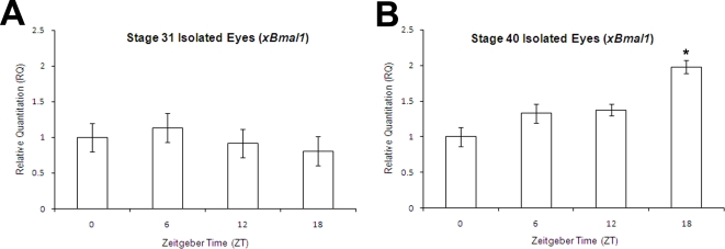 Figure 8. Isolated eyes show rhythmic expression of xBmal1 at stage 40 but not at stage 31.Eyes were dissected from embryos maintained in a 12L:12D cycle at different stages of development and different circadian times (ZT 0 (dawn), ZT6 (mid-day), ZT12 (dusk),and ZT18 (midnight)). The eyes were analyzed by qRT-PCR. The relative quantitation (RQ) of xBmal1 for each sample was calculated with respect to EF1α. No difference in the levels of xBmal1 expression was observed in stage 31 embryonic eyes at any time of day tested (ANOVA; df3, F = 1.77, p = 0.176; arrhythmic). A significant difference in xBmal1 expression was observed when all ZTs were analyzed in stage 40 embryonic eyes (ANOVA; df3, F12.23, p = 0.00009). The asterisk shows that the level of xBmal1 expression at ZT18 was significantly different from ZT0 (ANOVA, df1, F = 27.82, p = 0.0004). Bars in each graph denote standard error. |