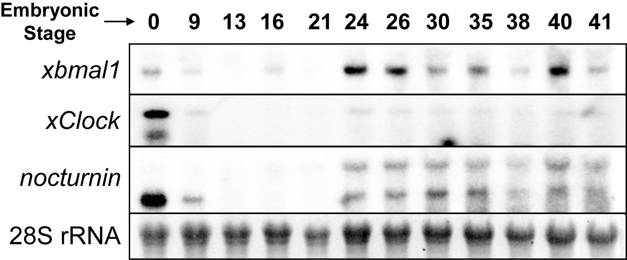 Figure 1. xClock, xBmal1 and xNocturnin are expressed as maternal messages before zygotic expression is observed at stage 24.
