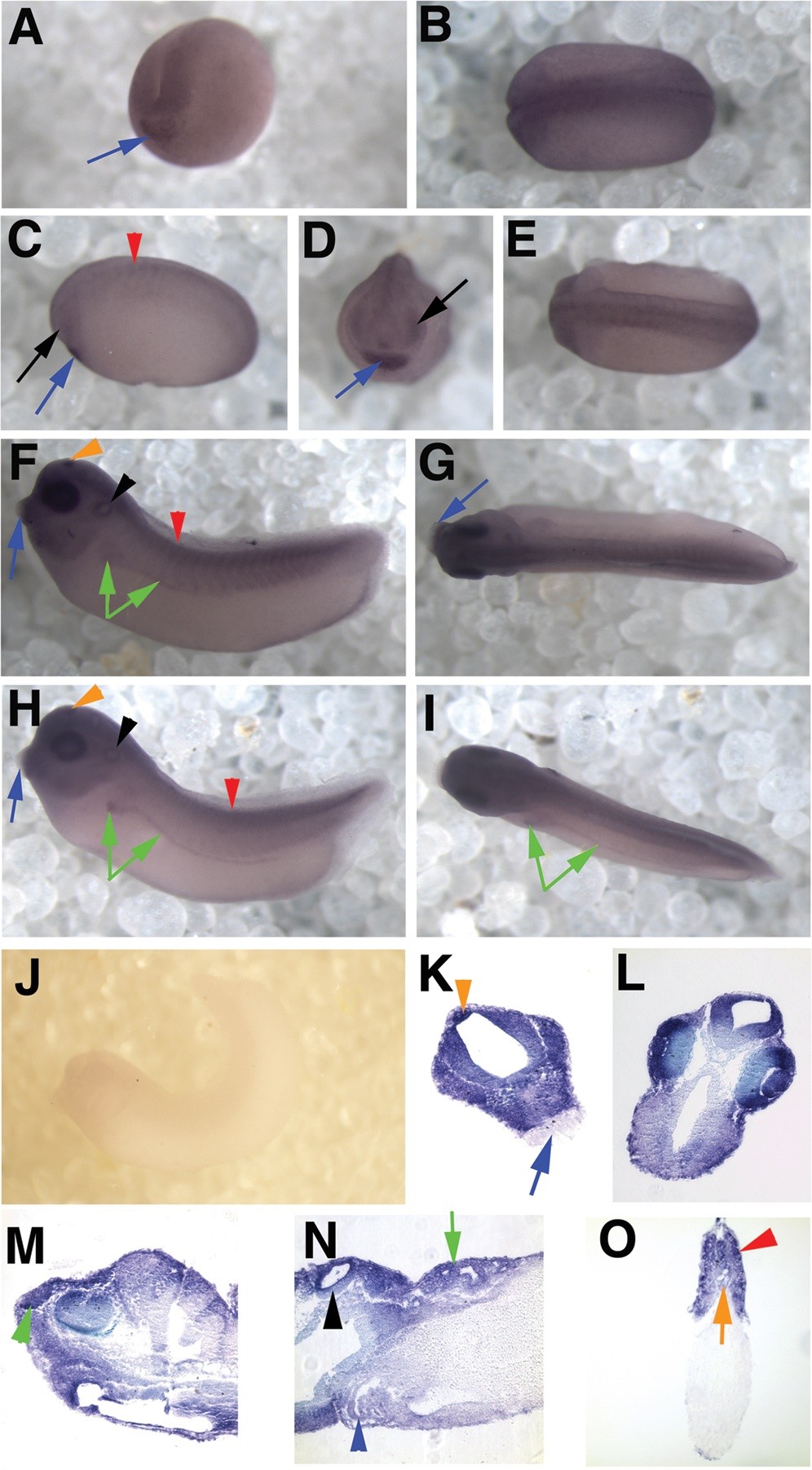Shown are in situ hybridization results depicting expression of xBmal1 mRNA. All embryos are oriented with the anterior to the left in all panels except A and D. Panel A shows the embryo from the anterior, but slightly angled to one side. D shows an anterior view. Panels C, F, H and J show side views of the embryos. Panels B, E G, and I show dorsal views of the embryos. Panels K and O show transverse sections and panel N shows a sagittal section of late tailbud embryos. Panel A and B depict a stage 18 embryo with xBmal1 staining in the neural plate and cement gland (blue arrow). C show stage 23 (neural tube stage) embryos with expression in the eye (black arrow), cement gland (blue arrow), and somites (red arrowhead). F show early (F) and late (H) tailbud stages where xBmal1 is expressed in the eye, pineal (orange arrowhead), otic vesicle (black arrowhead), somites (red arrowhead) and the pronephric tubules and duct (green arrows). Cement gland staining was lost (blue arrow). K and L show expression in the brain, retina/lens, pineal (orange arrowhead), and absence of staining in the cement gland (blue arrow). M show expression in the olfactory pit (green arrowhead), otic vesicle (black arrowhead), pronephric tubules (green arrow), heart (blue arrowhead), somites (red arrowhead), and notochord (orange arrow). No expression was seen using a sense probe specific to xBmal1 (J). |