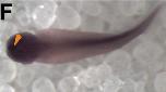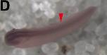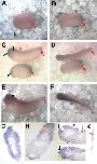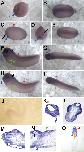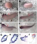 Shown are in situ hybridization results depicting expression of xPer2 mRNA. Panels A, B, D, and F show a dorsal view of each embryo. Panels C and E show side views. All embryos are oriented with the anterior to the left. G show transverse sections and J shows a sagittal section of late tailbud stage embryos. Sections shown in G, H, and J are oriented with the dorsal side at the top right of the panel. Neural plate staining is shown in panel A (stage 16) and B (stage 18). C and D depict early tailbud embryos with continued expression in the CNS as well as in the eye (black arrow), otic vesicle (black arrowhead), cement gland (blue arrow) and somites (red arrowheads). In late tailbud embryos (E and F), xPer2 is expressed in the otic vesicle (E,I, black arrowhead), pineal (F,G, orange arrowhead), brain, retina, lens (G), and olfactory pit (I, green arrowhead), although cement gland staining was lost (E, blue arrow). xPer2 was also present at low levels in the heart (H, blue arrowhead) and notochord (J, orange arrow). J also shows somite staining (red arrowheads). |