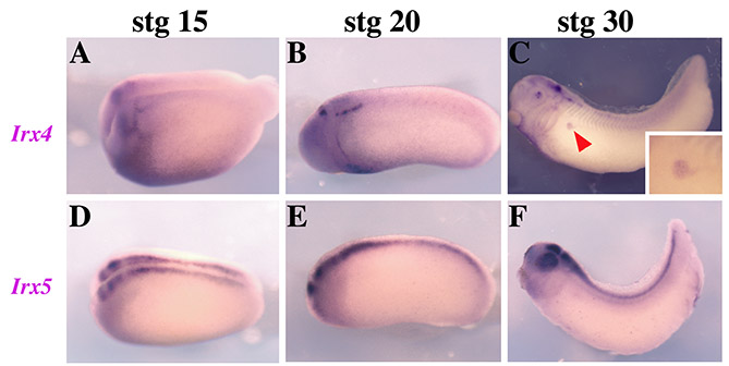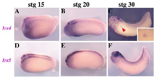Fig. S1. Irx4 and Irx5 expression pattern in Xenopus. Lateral views of Xenopus embryos at different developmental stages, as indicated. (A-C) Irx4 expression is detected in the pronephros at stage 30. Inset in C show a detail of this expression. (D-F) No expression of Irx5 is observed in the pronephros at these stages.