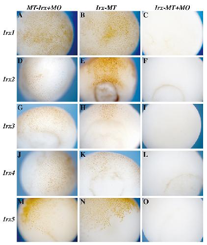 Fig. S2. Specificity of Irx morpholinos. To test the specificity of the morpholinos (MOs), we generated Xenopus laevis Irx constructs bearing a Myc epitope either at the N (MT-Irx) or at the C terminus (Irx-MT). MOs are antisense oligonucleotides that block translation efficiently only if their target sequence is within 25 bases of the translation start site. This is the case for Irx-MT mRNA but not for the MT-Irx transcripts. (A,D,G,J,M) Myc staining of stage 12 embryos injected with 0.5 ng of MT-Irx mRNAs and 10 ng of the corresponding MO. The MOs are unable to block MT-Irx translation. (B,E,H,K,N) Myc staining in stage 12 embryos injected with 0.5 ng of Irx-MT mRNAs. (C,F,I,L,O) Myc staining in stage 12 embryos injected with 0.5 ng of Irx-MT mRNAs and 10 ng of the corresponding MO. Each MO effectively blocks the translation of its corresponding Irx-MT mRNA. The different MOs can only block the translation of their corresponding genes (not shown). |