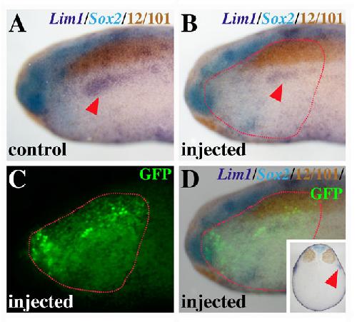 Fig. S4. Transplanted Irx morphant tissue showed impaired pronephros, but not muscle or neural tissue, development. The same embryo, stained for markers for pronephros (Lim1, purple), neural tissue (Sox2, blue) and somatic muscles (12/101, brown) is shown in all panels. (A) Control side showed normal Lim1 expression (arrowhead). (B) The transplanted Irx1 and Irx3 morphant tissue, outlined in red, showed reduced Lim1 expression (arrowhead). No effect was observed in muscles or neuroectoderm. (C) GFP localization on the side containing the transplanted tissue. (D) Overlay of B and C showing the extent of the transplanted area. Inset in D shows a transversal section of this embryo. Lim1 (arrowhead), but not Sox2 or 12/101, levels are reduced in the transplanted side. |