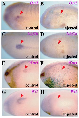 Fig. S5. Irx genes are required for maintaining the expression of kidney genes. Embryos injected with a mix of Irx1 and Irx3 MOs were assayed for the expression of different kidney genes at early late neurula-early tailbud stages. (A,C,E,G) Control uninjected sides. (B,D,F,H) Depletion of Irx activity downregulates the expression of Osr2 (B), Nhf1β (D), Wnt4 (F) and Wt1 (H) |