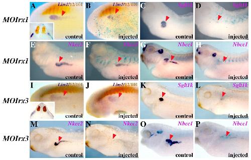 Fig. 2. Irx1 and Irx3 are necessary for kidney formation in Xenopus. Embryos are shown in lateral views; red arrowheads indicate the kidney territory. Embryos were injected in a single blastomere (V2.2) at the 8- to 16-cell stage and lacZ mRNA was used as linear tracer. Control and injected sides of the same embryo are shown, respectively, of the same specimen. The gene examined in each condition is indicated in the right upper corner of the panels in all figures. (A-H) Embryos injected with MOIrx1 showed reduced Lim1 expression at late neurula (A,B) and downregulation of Sglt1k (C,D), Nkcc2 (E,F) and Nbcc1 (G,H) expression at tadpole stages. Inset in (A) indicates a transverse section of the embryo shown in the major panel. (I-P) Similar results were found upon MOIrx3 injection. |