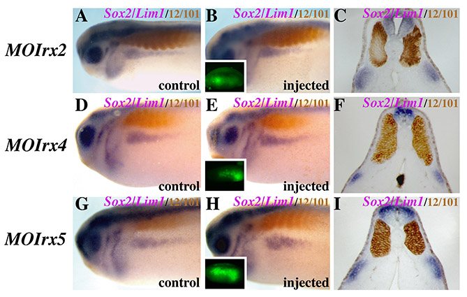 Fig. S3. Irx2, Irx4 and Irx5 are not required for kidney formation. All embryos were injected with specific Irx MOs and GFP mRNA in V2.2 blastomere of 8- to 16-cell stage embryos. Stage 22 embryos injected and triple labelled for Sox2 and Lim1 in purple and 12/101 in brown. (A,D,G) Control uninjected sides. (B,E,H) Morpholino-injected sides. Insets show the GFP distribution in the injected embryos. Impairment of Irx2, Irx4 or Irx5 does not affect Lim1 expression. Transverse sections of injected embryos are shown in C,F,I. |