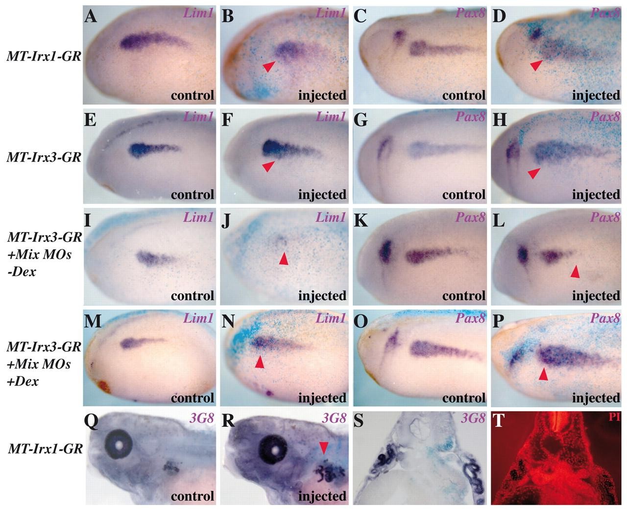 Fig. 4. Overexpression of Irx genes in Xenopus expands the pronephric territory. Embryos are shown in lateral views (except when indicated). Embryos were injected in a single blastomere (V2.2) at the 8- to 16-cell stage and lacZ mRNA was used as linear tracer. Neurula (A-P) or tadpole (Q-R) embryos injected with different mRNAs. Transverse sections of tadpole embryos are shown in S,T. (A-H) Overexpression of 300 pg of MT-Irx1-GR (A-D) or MT-Irx3-GR (E-H) mRNAs expands (arrowheads) ventrally the expression of Lim1 (A,B,E,F) and Pax8 (C,D,G,H) upon addition of dexamethasone (Dex) at stage 14, whereas no effect was observed in the absence of Dex (not shown). (I-P) Embryos co-injected with a mix of Irx1 and Irx3 MOs and MT-Irx3-GR mRNAs show strong downregulation of Lim1 (I,J; arrowhead) and Pax8 (K,L; arrowhead) in the absence of Dex. (M-P) This phenotype is rescued upon addition of hormone at stage 14. (Q-T) Tadpole embryos injected with MT-Irx1-GR mRNAs and Dex treated at stage 14 show enlarged kidneys (Q,R; arrowhead), as determined by staining with the 3G8 antibody. (S) Transverse section of a similarly injected embryo. (T) The same section treated with propidium iodide for nuclear staining. The control and the enlarged pronephros show the same cellular morphology. |