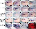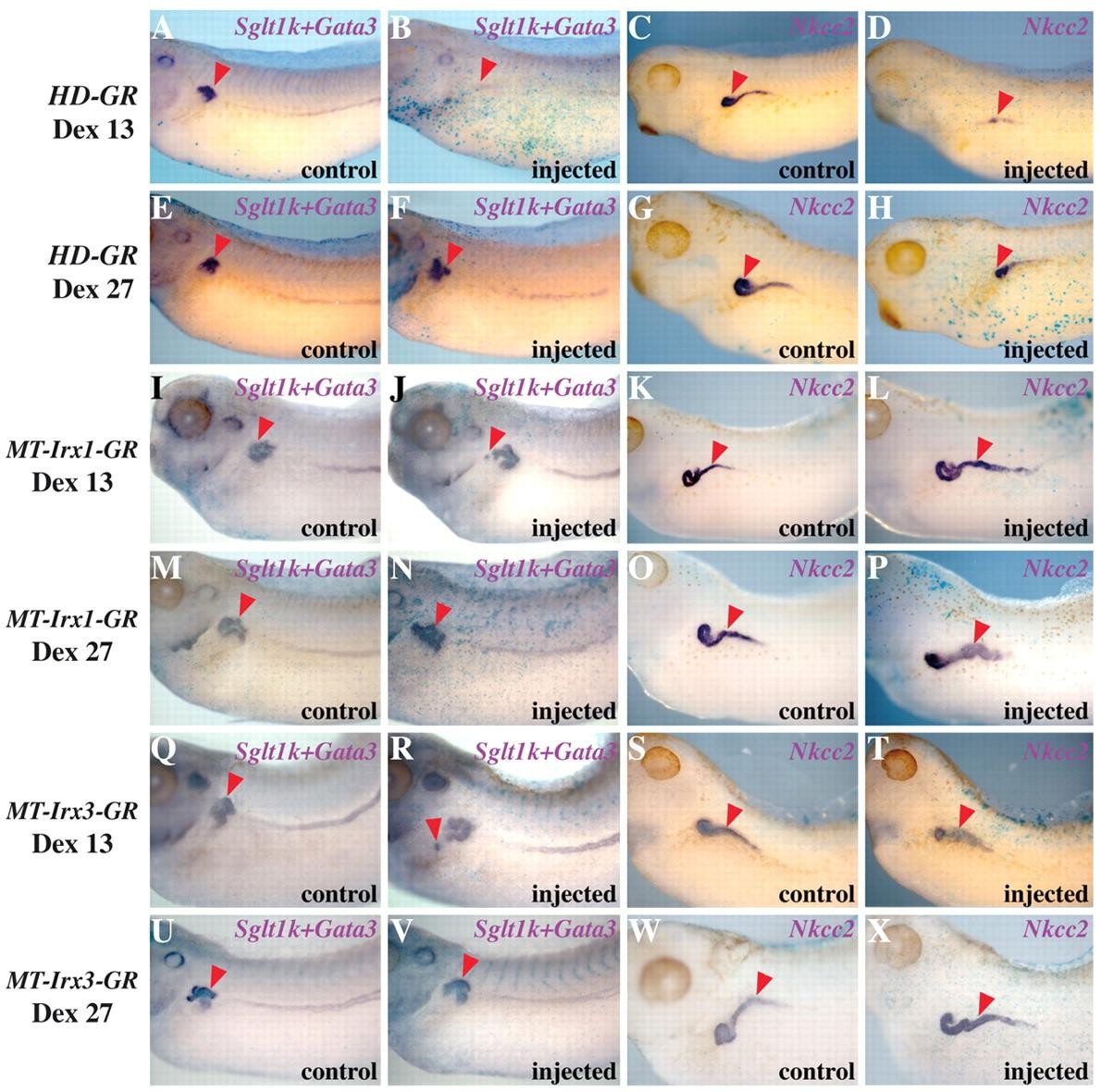 Fig. 8. Temporal requirement for Irx function during proximal-distal pronephric patterning. Embryos are shown in lateral views and red arrowheads indicate the kidney territory. Embryos were injected in a single blastomere (V2.2) at the 8- to 16-cell stage and lacZ mRNA was used as linear tracer. (A-H) Xenopus embryos injected with HD-GR mRNA. (A-D) Impairment of Irx activity during neurula stages downregulated Sglt1k, Gata3 (A,B) and Nkcc2 (C,D) expression. (E-H) Impairment of Irx activity during tailbud stages did not affect Sglt1k or Gata3 (E,F) but reduced Nkcc2 (G,H) expression. (I-P) Embryos injected with MT-Irx1-GR mRNA. (I-L) Increasing Irx1 function during neurula caused ectopic, patched Sglt1k (I,J) and enlarged Nkcc2 expression domains (K,L). No effect was observed on the duct marker Gata3 (I,J). (M-P) Increasing Irx1 function during tailbud did not affect Sglt1k or Gata3 (M,N) but enlarged Nkcc2 (O,P) expression. (Q-X) Similar results were found in embryos injected with MT-Irx3-GR mRNA. |