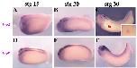 Fig. 5. Early Irx gene requirement for pronephros development occurs at neurula stages. Embryos are shown in lateral views. Embryos were injected in a single blastomere (V2.2) at the 8- to 16-cell stage and lacZ mRNA was used as linear tracer. Late neurula-early tailbud Xenopus embryos co-injected with 500 pg of HD-E1A-GR (A-H), HD-GR (I-P) or HD-EnR-GR (I,M, inset) mRNAs and assayed for expression of Lim1. (A-H) Embryos injected with a hormone-inducible activating form of Irx (HD-E1A-GR) show expanded Lim1 only when Dex was added during mid neurula stages (arrowheads). (I-P) Embryos injected with a hormone-inducible dominant negative (HD-GR) form of Irx show reduced Lim1 expression only when Dex was added during mid neurula stages (arrowheads). The same results were found with a hormone-inducible repressing form of Irx (HD-EnR-GR) (I and M, inset and not shown). |