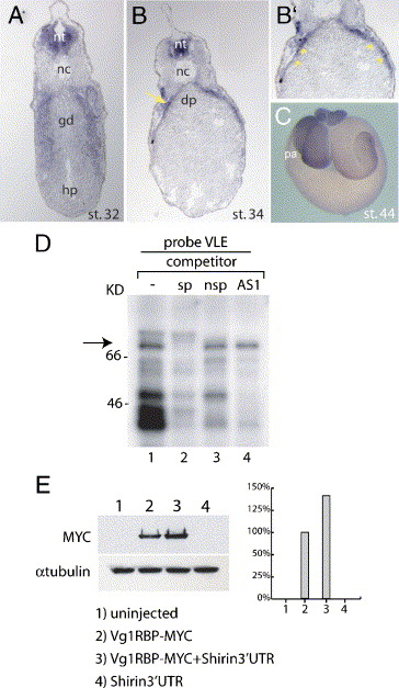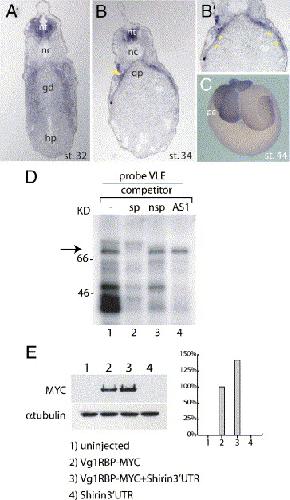 Supplementary Fig. S3. In situ hybridization for Vg1RBP expression in tailbudâtadpole stages embryos. (AâBâ²) In situ hybridization for Vg1RBP on progressive anterior to posterior sections of tailbudâtadpole stages embryos. (A) Transverse section of stage 32 embryo. (BâBâ²) Transverse section of stage 34 embryo. Arrow in (B) indicates Vg1RBP transcript in the dorsal mesodermal layer. (Bâ²) Detail of panel B. Open arrowheads indicate Vg1RBP transcript in the dorsal mesodermal layer. Abundant expression of Vg1RBP is detected in the neural tube, as previously described (Yaniv et al., 2003). (C) Whole-mount in situ hybridization for Vg1RBP on stage 44 Xenopus gut. Abbreviations: dp, dorsal pancreatic rudiment; gd, gastroduodenal cavity; hp, hepatic cavity; nc, notochord; nt, neural tube; pa, pancreas. (D) UV cross-linking assay using 32P-VLE RNA as probe and Xenopus embryo extracts. In the absence of competitor RNA (lane 1). Competitions were carried out with 100-fold excess of specific competitor (sp, unlabeled VLE; lane 2), non-specific competitor (nsp, polylinker of MT-pCS2+; lane 3), 10 μM AS1 (lane 4). Arrow indicates the 69-kDa Vg1RBP cross-linked protein complex (Deshler et al., 1998, Havin et al., 1998). (E) Shirin 3â²UTR influences Vg1RBP protein levels. Uninjected embryos (lane 1); embryos injected with either myc-tagged Vg1RBP RNA (lane 2), myc-tagged Vg1RBP RNA together with Shirin 3â²UTR RNA (lane 3), or Shirin 3â²UTR RNA alone (lane 4) into the vegetal pole. Embryos were harvested at tadpole stage and processed for Western blot analysis of myc-tagged Vg1RBP and α-tubulin. On the right, histogram presents the quantification by densitometry of the Western blot. Protein level of myc-tagged Vg1RBP is set to 100% (lane 2), relative increase of 40% is observed in the presence of Shirin 3â²UTR (lane 3). The values were normalized to α-tubulin. The average of three experiments shows a relative increase of 35% (data not shown). |