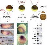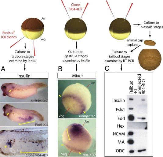 Fig. 1. Expression cloning of novel inducers of pancreatic fate. (A) Pools of 100 RNAs from a gastrula-stage cDNA library were injected into vegetal blastomeres of eight-cell stage Xenopus embryos. Tadpole stage embryos were hybridized to an antisense insulin probe. Whole-mount in situ hybridization using antisense insulin probe, top to bottom: uninjected embryo; embryo injected with 1 ng of 904 pool RNA; vibratome section of embryo injected with the single clone 904-4 D7 RNA. Arrowheads indicate endogenous insulin staining; brackets indicate ectopic insulin expression. An indicates animal pole; Veg indicates vegetal pole. (B) Gastrula stage embryo injected animally with 904-4 D7 and hybridized to an antisense mixer probe. Arrowheads indicate endogenous mixer staining; bracket indicates ectopic mixer expression in the ectoderm. An indicates animal pole; Veg indicates vegetal pole. (C) RT-PCR analysis of animal caps injected with 1 ng 904-4 D7 RNA and cultured until stage 32 (tailbud). Muscle Actin (MA) was used as marker of mesodermal cells at tailbud stage. ODC was used as a loading control for RT-PCR. |