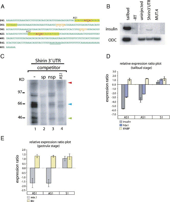 Fig. 4. Disruption of the Shirin 3â²UTR and Vg1RBP RNAâprotein interaction results in loss of Shirin insulin-inducing activity. (A) Nucleotide sequence of Shirin 3â²UTR from nt 241 to nt 606, showing two VM1 (orange in the figure) and two E2 motifs (purple in the figure). Underlined sequences indicate single nucleotide substitutions within the VM1 (UâG) and E2 (CâG) motifs. Sequences highlighted in yellow correspond to the sequences targeted by the 2â²-O-Me antisense oligoribonucleotides (AS1 and AS2). Sense oligoribonucleotides were used as control. (B) Mutational analysis of Vg1RBP-binding motifs in the Shirin 3â²UTR sequence. Animal caps injected with 1 ng of wild-type Shirin 3â²UTR and mutated Shirin 3â²UTR, bearing point mutations in all the four Vg1RBP-binding sites (indicated as MUT. 4), at the two-cell stage and analyzed for the expression of insulin by RT-PCR at stage 32 (tailbud). (C) UV cross-linking assay using 32P-Shirin 3â²UTR RNA as probe and Xenopus embryo extracts at tadpole stage. In the absence of competitor RNA (lane 1). Competitions were carried out with 100-fold excess of specific competitor (sp, unlabeled Shirin 3â²UTR; lane 2), non-specific competitor (nsp, polylinker of MT-pCS2+; lane 3), 10 μM AS1 (lane 4). Colored arrowheads indicate three major cross-linked proteic complexes. (D) Real-time RT-PCR analysis of Xenopus embryos injected with 2â²-O-Me antisense oligoribonucleotides. Two-cell stage embryos injected with 10 μM oligoribonucleotides (AS1 and S1) into the vegetal pole were analyzed for the expression of insulin, Pdx1, and IFABP by quantitative real-time RT-PCR at stage 32 (tailbud). The plot shows the regulation (expression ratio) of the target genes in injected embryos versus uninjected embryos (the control group). All the values were normalized to the reference gene, ODC, and calculated using the software REST© (Relative Expression Software Tool) (Pfaffl et al., 2002). In embryos injected with sense oligoribonucleotide sequence (S1), the expression of insulin and Pdx1 was unaffected. The experiment was repeated three times, and each time, two embryos for each condition (AS1-injected, S1-injected, uninjected) were examined. Data were determined in triplets. Similar observations were made also with the oligoribonucleotides AS2 and S2 (data not shown). (E) Real-time RT-PCR analysis of Xenopus embryos injected with 2â²-O-Me antisense oligoribonucleotides. Two-cell stage embryos injected with 10 μM oligoribonucleotides (AS1 and S1) into the vegetal pole were analyzed for the expression of mix.1 and BU by quantitative real-time RT-PCR at gastrula stage. |