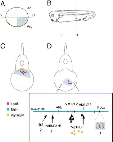 Fig. 7. Model for the trans-acting mechanism of Shirin 3â²UTR. (A) Schematic diagram of early stage embryo (egg-gastrula stage) showing localization of Vg1RBP protein at the vegetal pole and Shirin transcript in the dorsal vegetal emisphere. (B) Schematic diagram of tadpole embryo showing insulin-producing cells in the dorsal pancreatic rudiment (section C) and in ectopic patches along the gut (section D). (C) Diagram illustrating a transverse section through the dorsal pancreatic rudiment showing colocalization of Shirin and Vg1RBP transcripts in the dorsal mesodermal layer surrounding the pancreatic endoderm. (D) Diagram illustrating a transverse section of the gut following overexpression of Shirin 3â²UTR. Patches of insulin-expressing cells are induced ectopically. In the box a schematic representation of the Shirin 3â²UTR RNA sequence as a scaffold for factors possibly mediating insulin expression. Vg1RBP protein is recruited and stabilized by the RNA sequence. Also shown are the other trans-acting factors that interact with Shirin 3â²UTR, such as hnRNPA/B and Ilf2. Hypothetical Kbox-miRNA duplex is shown as additional potential mechanism of action of Shirin 3â²UTR. |