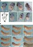 Fig. 5. Vg1RBP is required for pancreas formation. (A) Whole-mount in situ hybridization using antisense insulin probe in embryos, stage 43. Ventral views. Top panel, left to right: uninjected embryo, arrow indicates insulin expression in the pancreas; two embryos injected with 10 ng of Vg1RBPMo, arrowheads indicate defects in gut coiling and looping on the right side of the gut; dorsal view of an embryo injected with 10 ng of Vg1RBPMo shows no phenotypic abnormalities, suggesting that the effects of Vg1RBPMo are specific to the developing gut. Bottom panel, left to right: schematic representation of the gut of stage 43 embryo, arrowheads indicate the first loop of the small intestine posterior to the stomach; embryos injected with 10 ng Control Morpholino oligonucleotide (CoMo) ; coinjection of Vg1RBPMo with 0.5 ng Vg1RBP RNA rescues coiling of the anterior portion of the gut and expression of insulin in the pancreas. (B) Whole-mount in situ hybridization for insulin in embryos, stage 33. Top, left to right: uninjected embryos, arrowhead indicates insulin expression in the dorsal pancreatic bud; embryos injected with either 5 or 10 ng of Vg1RBPMo, as indicated. Bottom, left to right: embryos injected with 10 ng CoMo; coinjection of Vg1RBPMo with 0.5 ng Vg1RBP RNA rescues normal expression of insulin in the dorsal pancreatic rudiment. (C, C′) Higher magnification of one of the 10 ng Vg1RBPMo-injected embryos in (B). Clearing in Benzyl benzoate/Benzyl alcohol (C′) confirmed the absence of insulin-staining cells. |