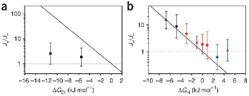Figure 3. The gating asymmetry ratio J+/J− as a function of free energy released from chloride transport, ΔGCl, and proton transport, ΔGH. The black solid lines show the maximal expected gating asymmetry for the case in which the gating is powered by chloride transport (a) or proton transport (b). Error bars represent the 95% confidence intervals. In b, the different colors code for different values of pHext (black, 7.5; red, 8.5; blue, 9.5) and the different symbols represents different voltages (circles, −50 mV; squares, −58 mV; triangles, −70 mV; diamonds −90 mV). Thus, the data points represented by the same symbols (but different colors) have the same electrochemical gradients for chloride ions (but different electrochemical gradients for protons).