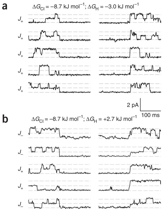 Figure 2. Slow-gate closures recorded from patches with identical chloride gradients and different proton gradients. For each patch, the first five asymmetrical slow-gate closures are shown. For both patches, the chloride concentration was 120 mM (symmetrical) and the membrane voltage was held at −90 mV. In a, a one-pH-unit gradient (pHint 7.5, pHext 8.5) was imposed; in b, a two-pH-unit gradient (pHint 7.0, pHext 9.0) was imposed. The corresponding energies for the chloride and proton electrochemical gradients (ΔGCl and ΔGH) are noted.