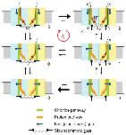 Figure 4. A possible model for non-equilibrium gating in ClC-0. The diagrams represent ClC-0 dimers with chloride pathways (green) and proton pathways (orange). Both pathways are controlled by the fast gate (dark blue) at the extracellular side. Only the chloride pathway is gated by the slow gate (black) at the intracellular side. The slow gates within individual subunits of the dimer are coupled (gray ‘spring’), such that these gates always open and close simultaneously. The number in the corner of each diagram indicates the number of open chloride pores (that is, the conductance level). The red spheres represent protons binding inside the translocation pathway. The proton electrochemical gradient is inward (movement of protons from outside to inside is energetically downhill) and hence J+/J− > 1. In this framework, the simple assumption that binding of protons to the intracellular site favors slow-gate opening results in cycling in the J+ direction. Experimentally, this is observed as channels more often entering the inactivated state (left-hand column) from the one-pore open state and returning from inactivation to the two-pore open state. (Note: transitions to the inactivated state directly from the level-1 state (right, middle) cannot be distinguished experimentally from those that occur from the level-0 state (right, below).) The slow gate opens more frequently when the fast gates are open because the protons can enter and bind to the activation site; the slow gate closes more frequently when the fast gates are closed because the protons escape down their electrochemical gradient.