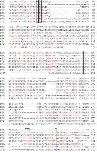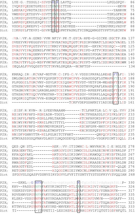 FIGURE 1. Sequence line-up of the extracellular domain of human P2X1–7 receptors and the Dictostelium discoideum (Dict) P2X receptor (37). Residues conserved in at least 5 of the human P2X receptors are shown in red. Alanine or cysteine mutants of the P2X1 receptor that have no or less than a 10-fold change in ATP potency are shown in lowercase gray (12, 16). P2X1 receptor mutants with a greater than 10-fold decrease in ATP potency are shown in blue. Residues that have been suggested to be important in ATP action are boxed (12, 16). Cysteine mutants of P2X2 and P2X4 receptors characterized in this paper are shown in green. |