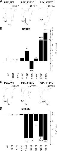 FIGURE 6. Effect of MTS compounds on ATP responses of P2X4 cysteine mutants. A, trace data representative of currents observed on the addition of MTSEA (1 mm). ATP application (EC50 concentration) is indicated by the bar. MTSEA reagent was bath applied 5 min prior to U-tube ATP coapplication with MTSEA. Traces are shown in response to ATP for a given oocyte before and during the application of MTSEA. B, graph representing the effect of MTSEA on the P2X4 WT and mutant receptors (n = 3–8). C, trace data representative of currents observed on the addition of MTSES (1 mm). ATP application (EC50 concentration) is indicated by the bar. MTSES reagent was applied in a similar manner to MTSEA. Traces are shown in response to ATP for a given oocyte before and during the application of MTSES. D, graph representing the effect of MTSES on the P2X4 WT and mutant receptors (n = 3–6). *, p < 0.05; **, p < 0.01; ***, p < 0.001. |