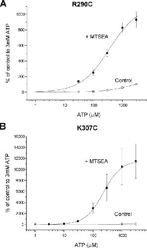 FIGURE 4. Effect of MTS compounds on ATP potency at P2X2 cysteine mutants. A, ATP concentration-response curve for R290C under control conditions or following washout of MTSEA after a 10-min incubation with MTSEA (1 mm)(n = 3–4). B, ATP concentration-response curve for K307C under control conditions or following washout of MTSEA after a 10-min incubation with MTSEA (1 mm)(n = 3–6). The data are expressed as a percentage of the amplitude of the response to 3 mm ATP under control conditions. |