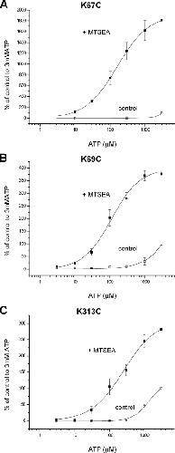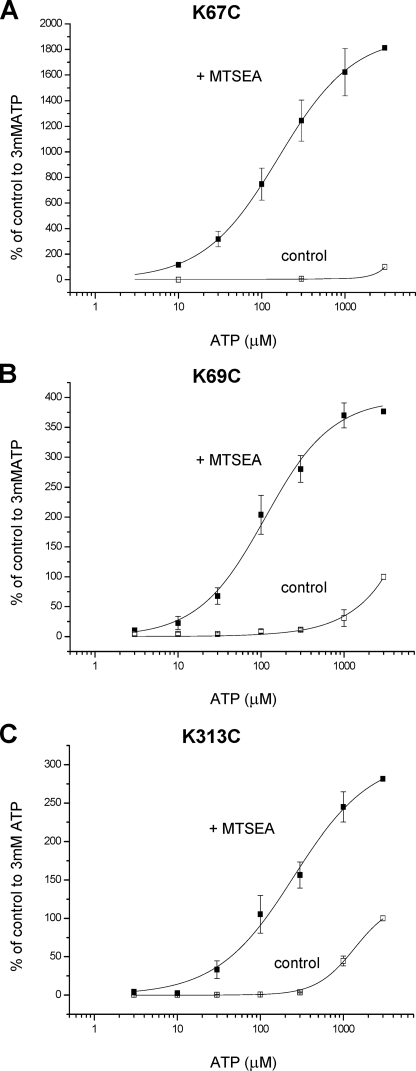 FIGURE 7. Effect of MTS compounds on ATP potency at P2X4 cysteine mutants. A, MTSEA significantly increased the potency of ATP and amplitude of responses at K67C mutants. B, MTSEA significantly increased the potency of ATP and amplitude of responses at K69C mutants. C, MTSEA significantly increased ATP potency and peak response at K313C mutants (n = 3–4). The data are expressed as a percentage of the amplitude of the response to 3 mm ATP. For MTSEA treatment (1 mm, 1 h incubation, followed by washout and construction of the concentration response in the absence of MTSEA) these have been corrected with a scaling factor corresponding to the mean -fold increase, at 3 mm ATP, in currents compared with untreated oocytes. |