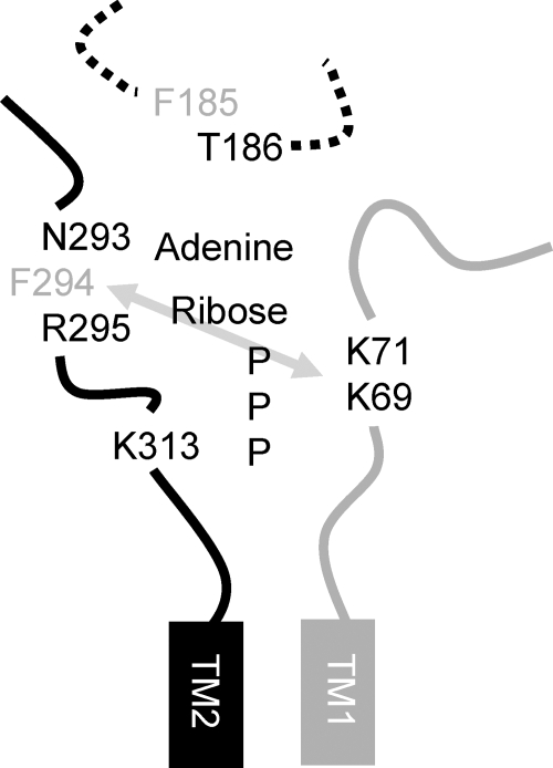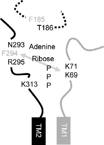 FIGURE 8. Model of the ATP binding site at P2X receptors. Portions of the extracellular loop adjacent to either the first (in gray) or second (in black) transmembrane domain are shown for two adjacent P2X receptor subunits (numbering for the P2X4 receptor). The gray arrow represents the disulfide bond that can be formed between cysteine mutations of these residues at the P2X1 receptor (18). Residues that showed a decrease in ATP potency when mutated to cysteine are shown, those in black correspond to those that were modified by MTS reagents, whereas those in gray were unaffected by either MTSEA or MTSES. Positively charged MTSEA increased the amplitude and potency of responses at cysteine mutants of the P2X4 receptor at positions Lys69, Lys71 and Lys313, this suggests a role of these residues in coordinating the binding of the negatively charged phosphate of ATP, however, it is possible that they also contribute to the gating of the channel as has been suggested for the residue equivalent to Lys313 at the P2X2 receptor (32). The conserved FT region is shown as a dotted line as it has been shown to be involved in agonist potency and is unclear whether the effects result from changes in agonist binding and/or gating. One possibility is that threonine could face the agonist binding pocket. |
