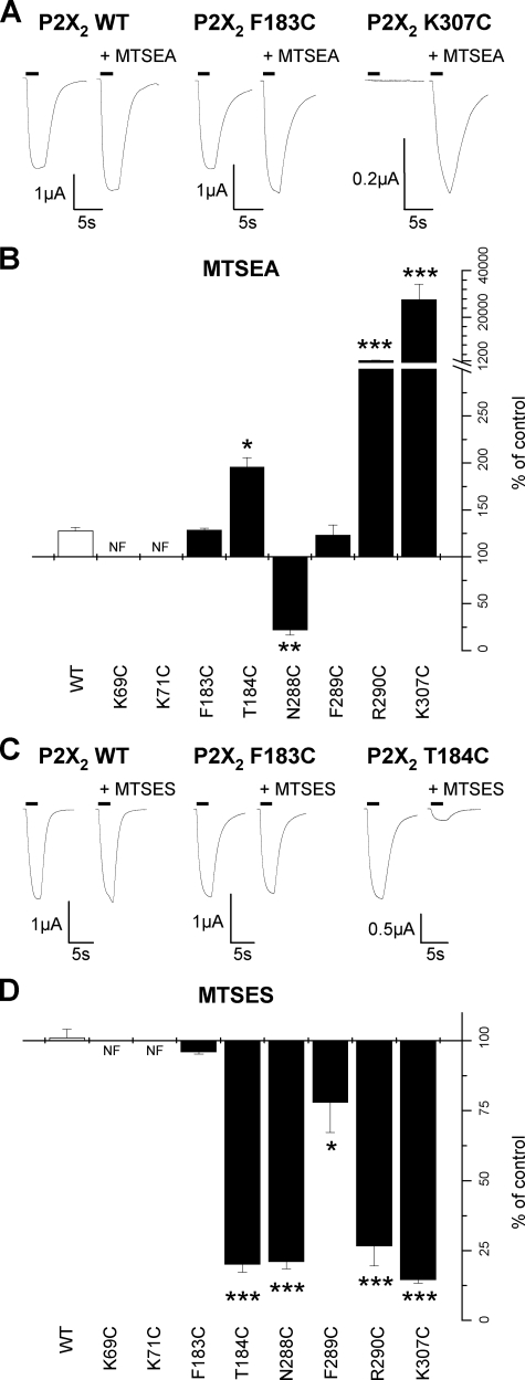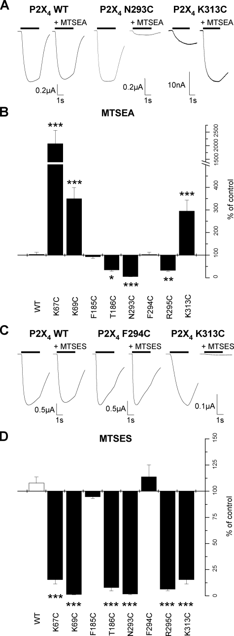 FIGURE 3. Effect of MTS compounds on ATP responses of P2X2 cysteine mutants. A, trace data representative of currents observed before and during the addition of MTSEA (1 mm). ATP application (EC50 concentration) is indicated by the bar. MTSEA reagent was bath applied 5 min prior to U-tube ATP coapplication with MTSEA. B, graph representing the effect of MTSEA on the P2X2 WT and mutant receptors (n = 3–6). C, trace data representative of currents observed with the addition of MTSES (1 mm). ATP application (EC50 concentration) is indicated by the bar. MTSES reagent applied in a similar manner to MTSEA traces are shown for a given oocyte before and during MTSES application. D, graph representing the effect of MTSES on the P2X2 WT and mutant receptors (n = 3–6). *, p < 0.05; **, p < 0.01; ***, p < 0.001. |