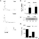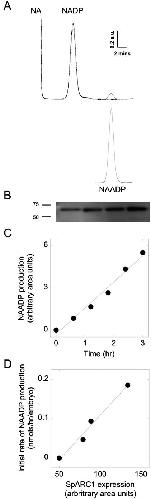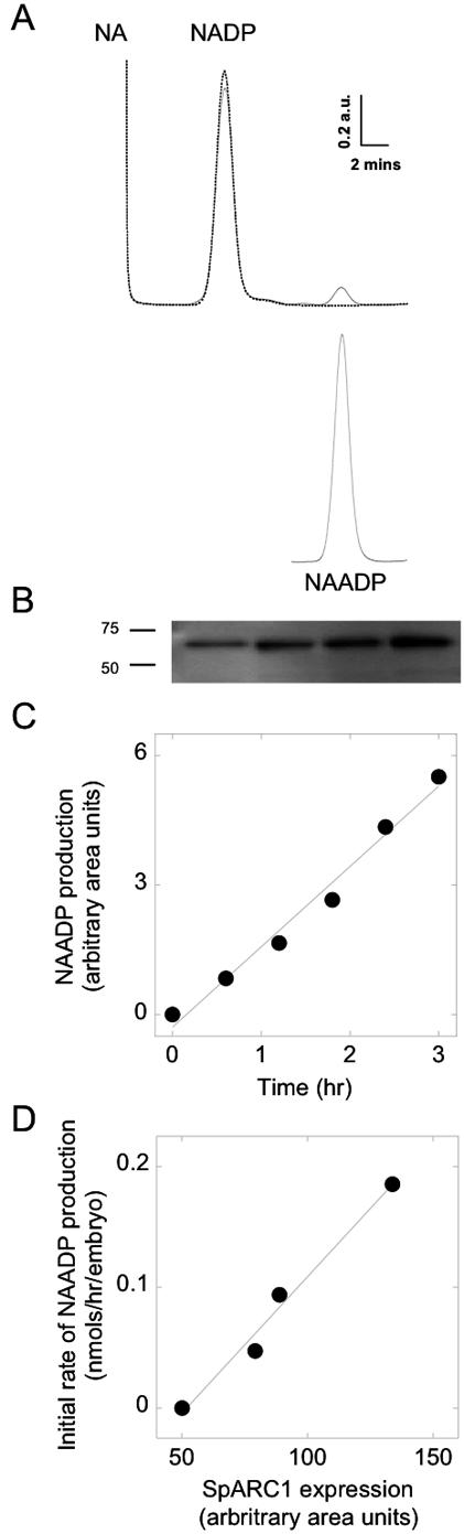 Figure 7. SpARC1 catalyses NAADP production.A, Hypotonic lysates from Xenopus laevis embryos were incubated with NADP (1 mM) and nicotinic acid (NA, 50 mM) at pH 4 for 21 h and the resulting mixtures separated by HPLC. The top chromatograms are from lysates prepared from control embryos (dashed lines) and embryos injected with myc-tagged SpARC1 mRNA (solid line). The elution of authentic NAADP is shown below. B, Western blot comparing SpARC1 expression in 4 independent embryo preparations. C, Production of NAADP following incubation of a typical embryo homogenate with substrates for the indicated times. D, A plot of the initial rate of NAADP production (measured over 3 h) against the level of SpARC1 expression (determined by densitometric analysis of Western blot data for the preparations analysed in B). |