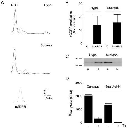 Figure 8. SpARC1 catalyses cyclic GDP-ribose production.Homogenates from Xenopus laevis embryos were incubated with 1 mM NGD for 21 h at pH 7.2 and the resulting mixtures separated by HPLC. A, Representative chromatograms from lysates prepared from control embryos (dashed lines) and embryos injected with myc-tagged SpARC1 mRNA (solid line). Both hypotonic lysates (Hypo.; top) or homogenates prepared in sucrose-containing medium (Sucrose; middle) were used. The elution of authentic cyclic GDP-ribose is shown below. B, Pooled data (mean+/−standard error of the mean) from 3 experiments comparing the amount of cyclic GDP-ribose produced using either control (C) or SpARC1-expressing preparations. C, Western blot analysis of myc-tagged SpARC1 expression in pellet (P) and supernatant (S) fractions prepared following centrifugation of the two reaction mixes from a typical experiment described in A at the end of the incubation period. D, 45Ca flux uptake by homogenates prepared from Xenopus embryos (in sucrose-containing media) or sea urchin eggs either in the absence (−) or presence (+) of the sarco-endoplasmic reticulum calcium ATPase inhibitor, thapsigargin (Tg; 1 µM). Data are presented as means±standard deviation of triplicate samples from one of 3 independent experiments. |