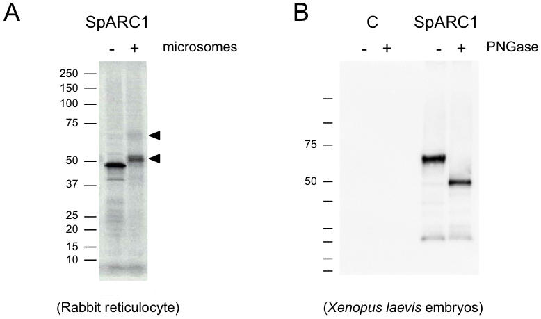 Figure 2. SpARC1 is glycosylated.A, In vitro translation. mRNA coding for C terminally myc-tagged SpARC1 was translated in the presence of [35S]methionine using rabbit reticulocyte lysate. Autoradiogram of translation reactions performed in the absence (−) or presence (+) of canine pancreatic microsomes. B, Expression of SpARC1 in Xenopus laevis embryos. Western blot analysis using an anti-myc antibody of homogenates prepared from control embryos (C) or embryos injected with mRNA for myc-tagged SpARC1. Samples were either mock treated (−) or digested with PNGase F (+) prior to analysis (left). Migration of molecular mass markers (in kDa) is shown on the left of the panels. |