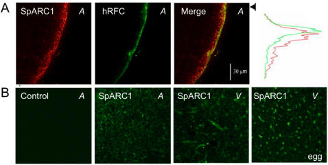 Figure 5. SpARC1 localizes to the endoplasmic reticulum in Xenopus laevis oocytes and eggs.A, Confocal fluorescence images of Xenopus laevis oocytes co-expressing myc-tagged SpARC1 (red) and GFP-tagged human reduced folate carrier (hRFC, green). SpARC1 expression was detected by immunocytochemistry using an anti-myc primary antibody and an FITC labeled secondary antibody whereas hRFC was detected by GFP fluorescence. A plot of the individual emission intensities with depth averaged along a 5 µm wide section (arrowed line) in the overlay image is shown on the right. B, Lateral (‘xy’) images of SpARC1 expression (green) in oocytes and in eggs (right). The control image was obtained from an identically processed un-injected oocyte. Images were captured from the animal (A) and vegetal (V) poles as indicated. |